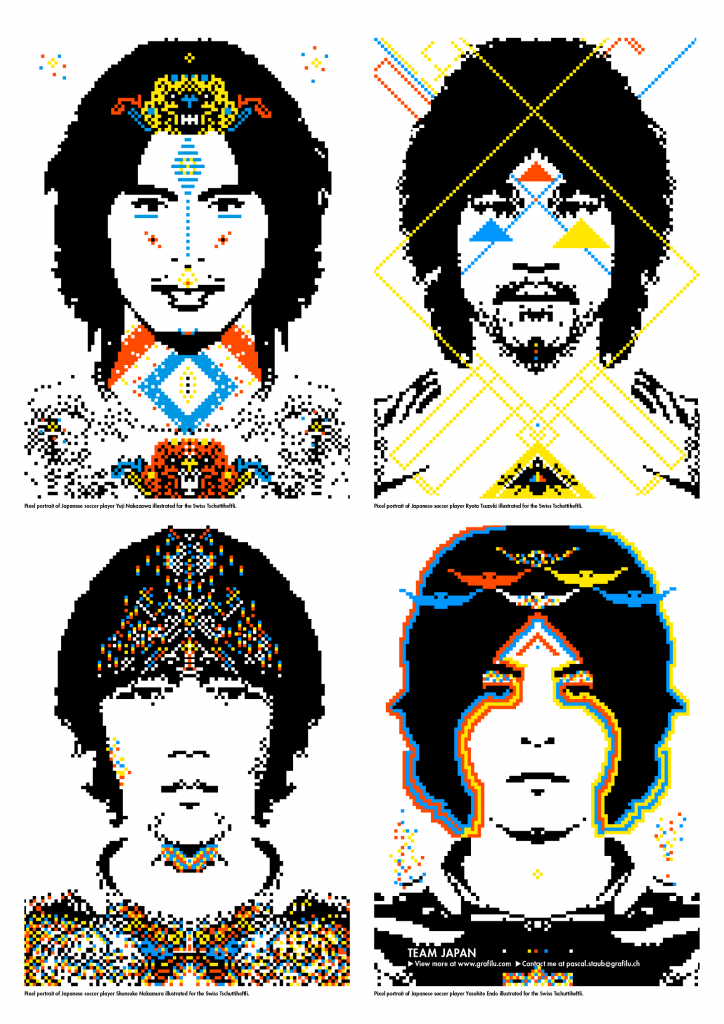 Portraits of the Japanese soccer team 2010, united by their color palette and reduction to black and white pixel compositions.