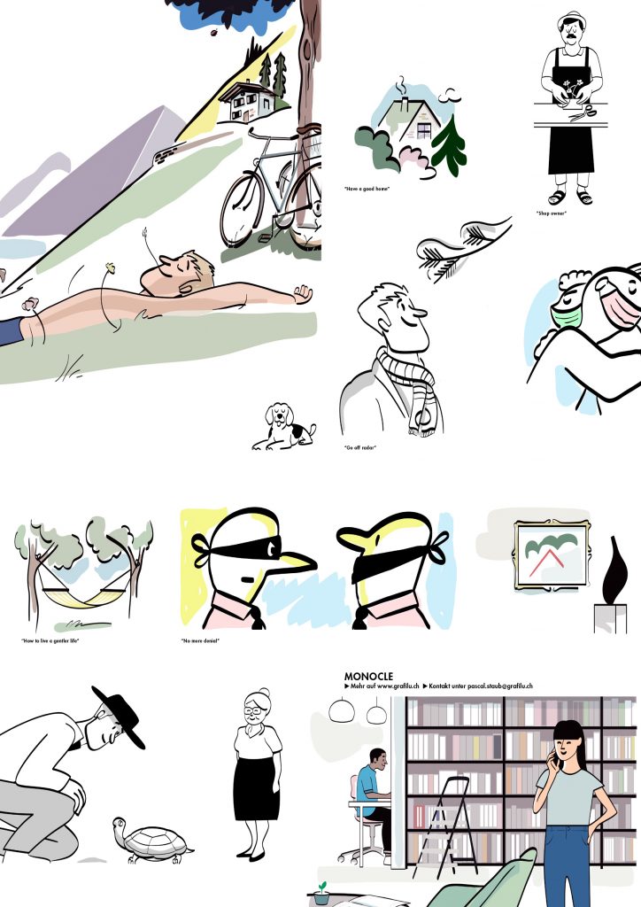 The illustration work created for Monocle spans from loose to controlled echoing various levels of complexity and demand that come with different kinds of subject matter and application.