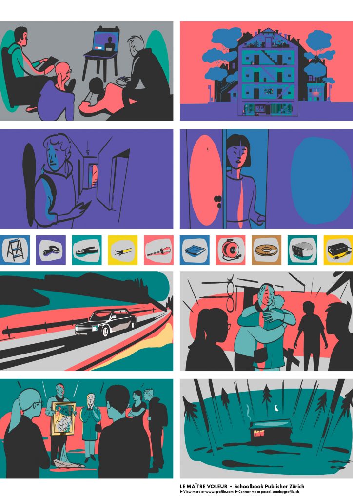 Playful lines and colourful forms illustrate, with a humorous touch, scenes inspired by the texts of Swiss author Julia Kohli.
